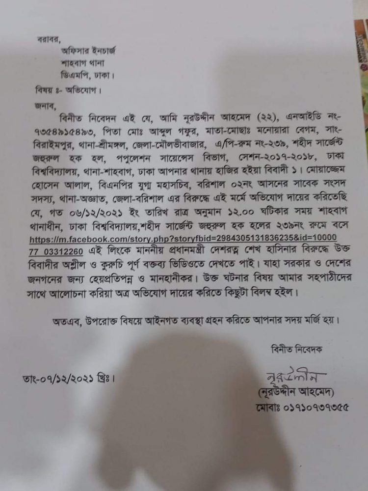 আলালের বিরুদ্ধে থানায় জমা দেওয়া অভিযোগে নূরউদ্দীন লিখেন, গত ৬ ডিসেম্বর রাত বারোটায় শহীদ সার্জেন্ট জহুরুল হক হলের ২৩৯নং রুমে বসে একটি লিংকে প্রধানমন্ত্রী শেখ হাসিনার বিরুদ্ধে আলালের ‘অশ্লীল ও কুরুচিপূর্ণ’ বক্তব্যের ভিডিও দেখতে পান। এটি সরকার ও দেশের জনগণের জন্য হেয়প্রতিপন্ন ও মানহানিকর। এই ঘটনার বিষয় সহপাঠীদের সঙ্গে আলোচনা করে অভিযোগ করতে কিছুটা দেরি হয়েছে।