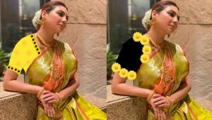 ছবিতে দেখা যায়, গোলাপি সিল্কের শাড়িতে চওড়া হলুদ পাড়। সামনে আঁচল দিয়ে শাড়িতে বাঙালিয়ানার ছাপ স্পষ্ট। তবে ব্লাউজ পরেননি জয়া। গলায় ভারী গয়না, কোমর বন্ধনী। খোঁপাও বেঁধেছেন টানটান করে, তাতে লাগিয়েছেন সাদা ফুলের মালা।