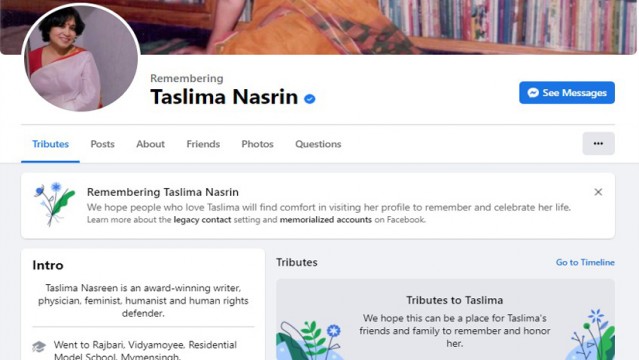 লেখিকা তসলিমা নাসরিনকে মৃত দেখাচ্ছে সামাজিক যোগাযোগ মাধ্যম ফেসবুক। মঙ্গলবার (১৮ জানুয়ারি) বিকেলে এই লেখিকার ভেরিফাইড পেজে ‘রিমেম্বারিং তসলিমা নাসরিন’ লেখাটি দেখা যায়।