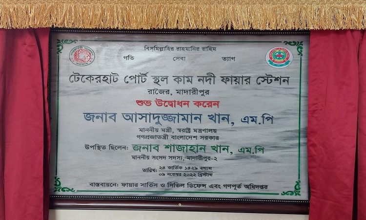 টেকেরহাট পোর্ট স্থল কাম নদী ফায়ার স্টেশনের শুভ উদ্বোধন করেছেন স্বরাষ্ট্র মন্ত্রণালয়ের মাননীয় মন্ত্রী জনাব আসাদুজ্জামান খান এমপি। ৯ নভেম্বর বিকেল ৪-৩০ ঘটিকায় তিনি প্রধান অতিথি হিসেবে উপস্থিত থেকে ফায়ার স্টেশনটির শুভ উদ্বোধন করেন। এ সময় মাদারীপুর-২ আসনের মাননীয় সংসদ সদস্য ও সাবেক মন্ত্রী জনাব মোঃ শাজাহান খান এবং স্বরাষ্ট্র মন্ত্রণালয়ের সুরক্ষা সেবা বিভাগের সচিব জনাব মোঃ আবদুল্লাহ আল মাসুদ চৌধুরী বিশেষ অতিথি হিসেবে উপস্থিত ছিলেন।