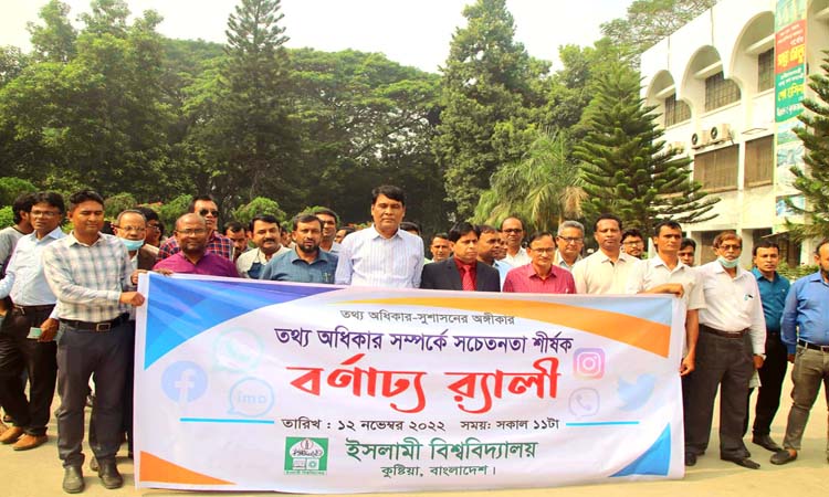 ইসলামী বিশ্ববিদ্যালয়ে (ইবি) ‘তথ্য অধিকার-সুশাসনের অঙ্গীকার’ এ শ্লোগানকে সামনে রেখে বিশ্ববিদ্যালয় প্রশাসনের উদ্যোগে র্যালি অনুষ্ঠিত হয়েছে। শনিবার (১২ নভেম্বর) বেলা সাড়ে ১১টায় প্রশাসন ভবনের সামনে থেকে র্যালিটি শুরু হয়ে ক্যাম্পাসের বিভিন্ন সড়ক প্রদক্ষিণ করে মৃত্যুঞ্জয়ী মুজিব ম্যুরালের পাদদেশে শেষ হয়। র্যালি শেষে তথ্য অধিকার সম্পর্কে সচেতনতায় সংক্ষিপ্ত সমাবেশ অনুষ্ঠিত হয়।