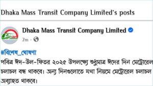 সেখানে বলা হয়, পবিত্র ঈদুল ফিতর ২০২৫ উপলক্ষে শুধুমাত্র ঈদের দিন মেট্রোরেল চলাচল বন্ধ থাকবে। অন্য দিনগুলোতে যথা নিয়মে মেট্রোরেল চলাচল অব্যাহত থাকবে।
