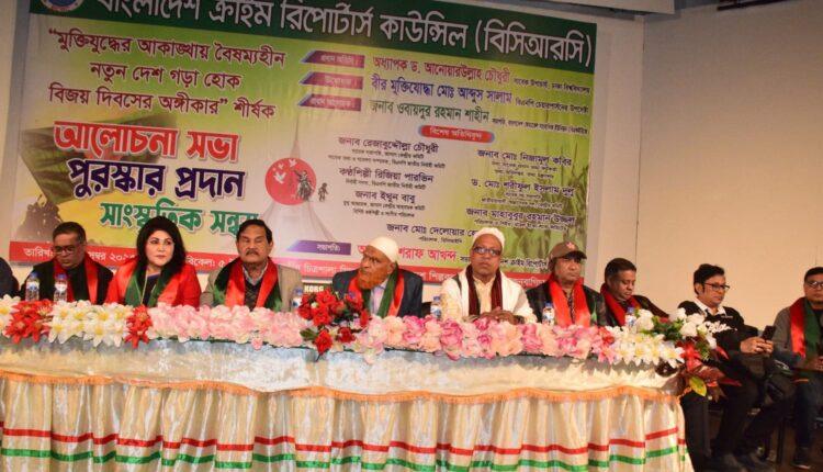 বাংলাদেশ ক্রাইম রিপোর্টার্স কাউন্সিল (বিসিআরসি)-এর উদ্যোগে মহান বিজয় দিবস উপলক্ষে আয়োজিত ‘মুক্তিযুদ্ধের আকাঙ্ক্ষায় বৈষম্যহীন নতুন দেশ গড়া হোক বিজয় দিবসের অঙ্গীকার’ শীর্ষক আলোচনা সভা ও ‘বিজয় দিবস সম্মাননা–২০২৫’ অনুষ্ঠানে এসব বক্তব্য উঠে আসে। সোমবার (২৯ ডিসেম্বর) সন্ধ্যায় ঢাকার বাংলাদেশ শিল্পকলা একাডেমির জাতীয় চিত্রশালা মিলনায়তনে এ আয়োজন অনুষ্ঠিত হয়