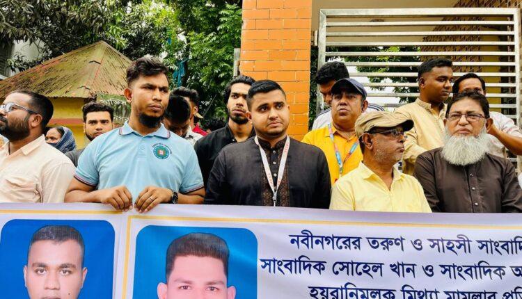 নবীনগর উপজেলা প্রেসক্লাবের প্রতিষ্ঠাতা সভাপতি সাংবাদিক সঞ্জয় সাহার সভাপতিত্বে ও সঞ্জয় শীলের সঞ্চালনায় মানববন্ধনে বক্তব্য রাখেন, নবীনগর প্রেসক্লাবের সাবেক সভাপতি মাহবুব আলম লিটন, উপজেলা প্রেসক্লাবের সভাপতি হেবজুল বাহার, সাধারণ সম্পাদক জহিরুল ইসলাম, সাবেক সাধারণ সম্পাদক রেজাউল করিম বাবুল, রিপোর্টার্স ক্লাবের সহ-সভাপতি রহমত উল্লাহ, সহ সাধারণ সম্পাদক জাবেদ আহমেদ জীবন, মডেল প্রেসক্লাবের সভাপতি আনোয়ার হোসেন, সাধারণ সম্পাদক সুমন উদ্দিন, সদর প্রেসক্লাবের সাধারণ সম্পাদক রুবেল আকরাম, নিউ মডেল প্রেসক্লাবের মহিলা সম্পাদিকা নার্গিস আক্তার সহ সাংবাদিক শাকিল সদ্দার, মাজেদুল ইসলাম, শফিউল আলম সৌরভ , মিঠু সূত্রধর পলাশ সহ সোহেল খান ও আশরাফুল হক প্রমুখবক্তারা তরুণ দুই সংবাদকর্মীর বিরুদ্ধে ব্রাহ্মণবাড়িয়া বিজ্ঞ আদালতে দায়ের করা মিথ্যা মামলা প্রত্যাহার সহ বাদীর বিরুদ্ধে ব্যবস্থা নেওয়ার জন্য পুলিশ প্রশাসনের প্রতি জোর দাবি জানান।